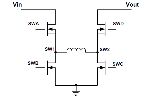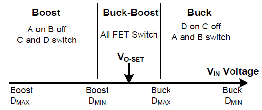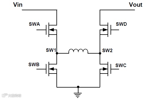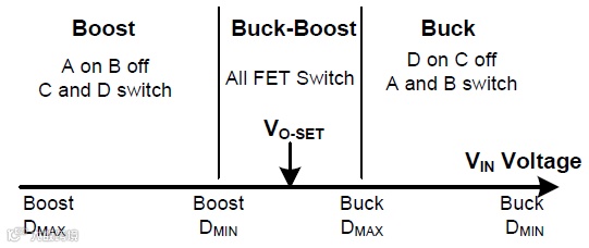 MPQ4230内部集成的4个MOS管交替导通,使其工作在Buck,Boost和Buck-boost模式。当Vin大于110%Vout时,工作在Buck模式;Vin小于90%Vout时,工作在Boost模式;Vin与Vout接近时,工作在Buck-boost模式。