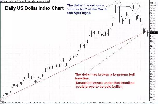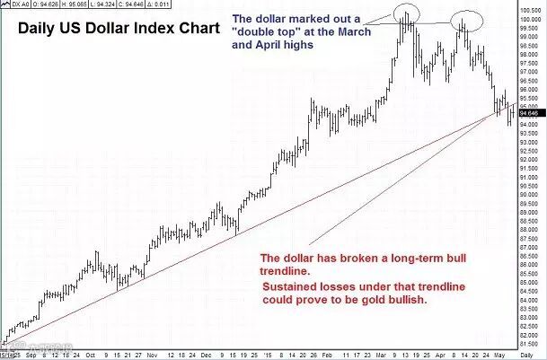 当前黄金市场仍在1130-1140美元的长期支撑区域上方震荡。从下图也可以发现,美元指数已经跌破了长期趋势支撑,且形成双顶形态,意味着后市可能遭到进一步抛售,这点有利于金价。