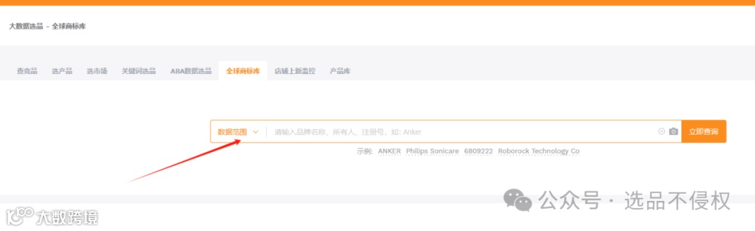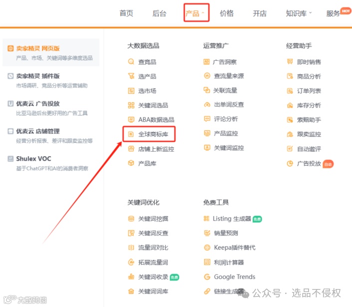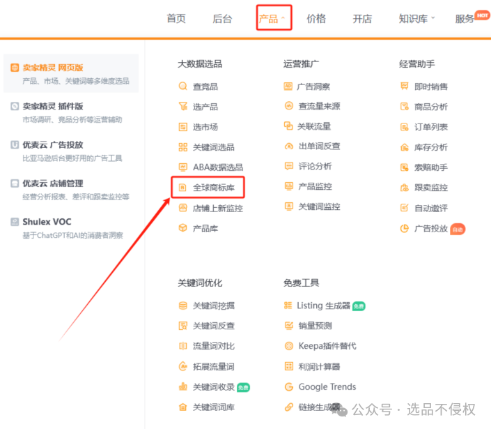 第一步、打开卖家精灵网页版,点击“产品”下的“全球商标库”