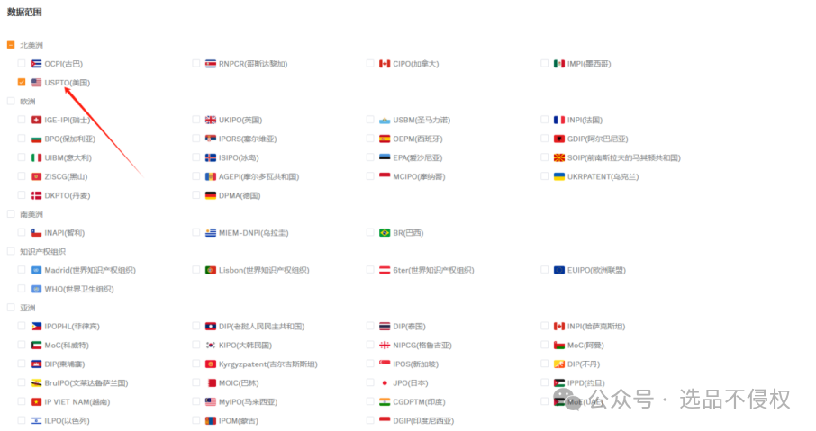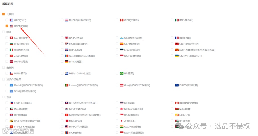 第二步、选择您想要查询的商标的数据范围,即对应的注册国家或地区。这里以美国站为例