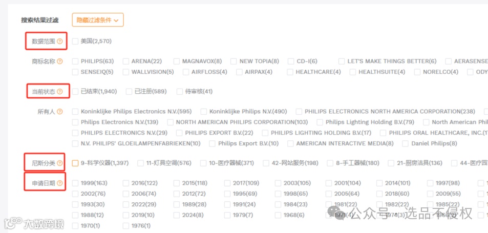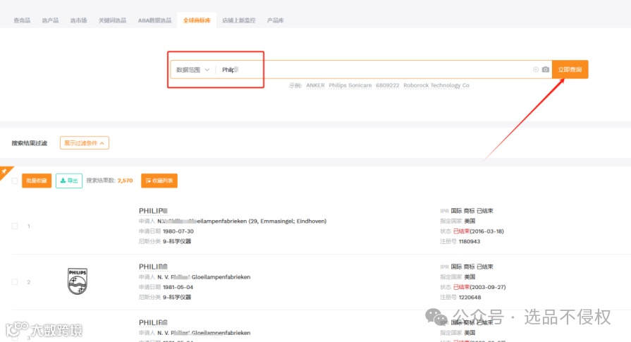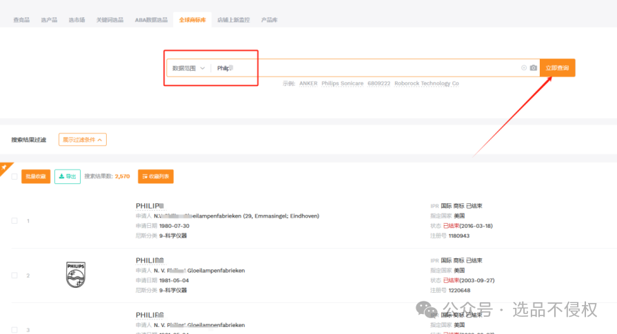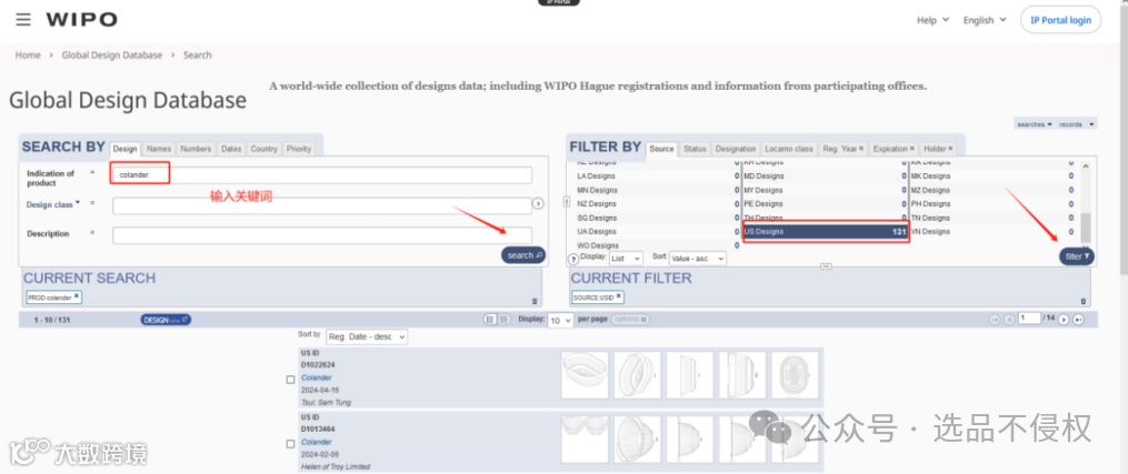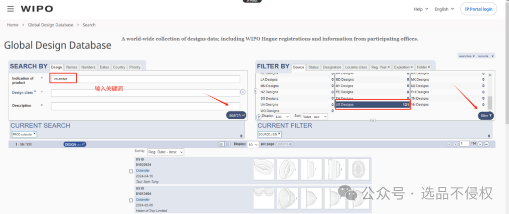外观专利可以用wipo-全球外观专利设计数据库来查,先输入关键词,点击查询,再选择站点,点击filter。