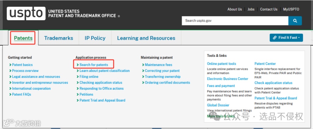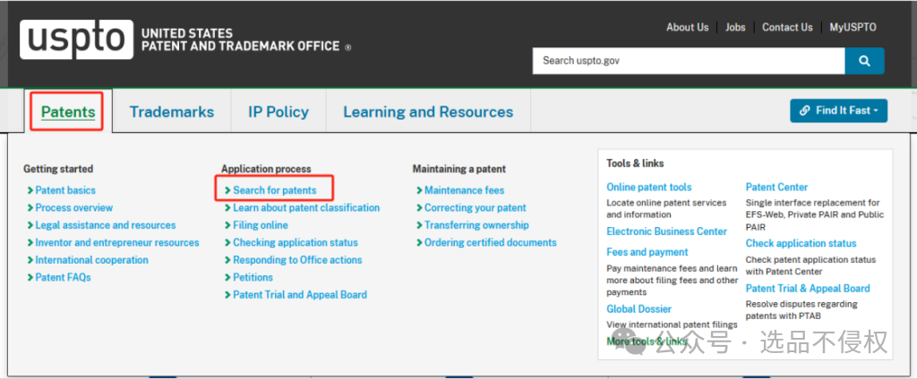 2、在官网首页,“Patents”选项,然后“Search for Patents”选项即可进入查询页面。