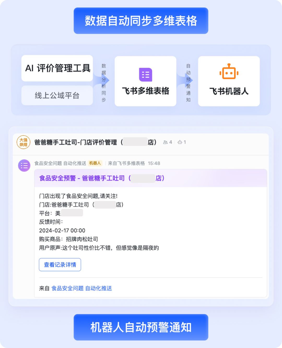 现在,AI 评价管理工具的分析结果,会定时自动同步至飞书多维表格, 24 小时自动化监控门店的线上运营表现。