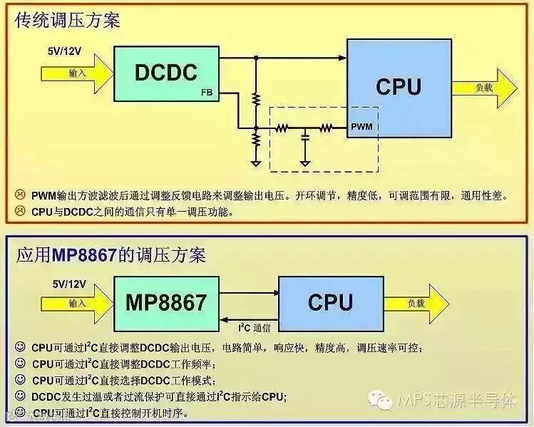 二是通过CPU输出PWM方波调整反馈回路来改变输出电压,开环调节,精度低,可调范围非常有限。由于外围电路与PWM占空比都是针对特定输出电压预先设计,灵活性与通用性差。并且只有单一调压功能无法实现DCDC与CPU之间更全面的通信。