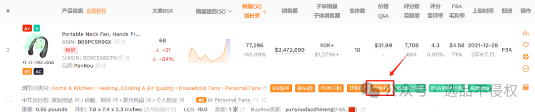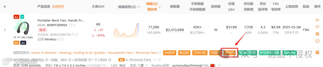 也可以在亚马逊前台,通过卖家精灵插件,点击产品图片右上角的“查专利”进入。