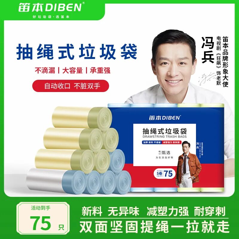 笛本5卷75只工厂直销抽绳式垃圾袋不易破加大不脏手W