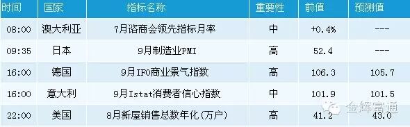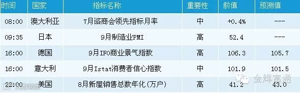 周三(9月24日)亚洲时段,投资者主要关注澳大利亚公布的领先指标月率以及澳洲联储公布的金融评审报告。近来澳元饱受中国方面经济数据疲软和中国经济政策的影响而持续走低。日内澳大利亚本国的政策走向和数据或许能给澳元带来自我救赎的机会。此外,日本方面在结束了周二的休市之后,日内还会公布制造业PMI数据,这或许会给日元短期走势带来影响,投资者可以稍加留意。