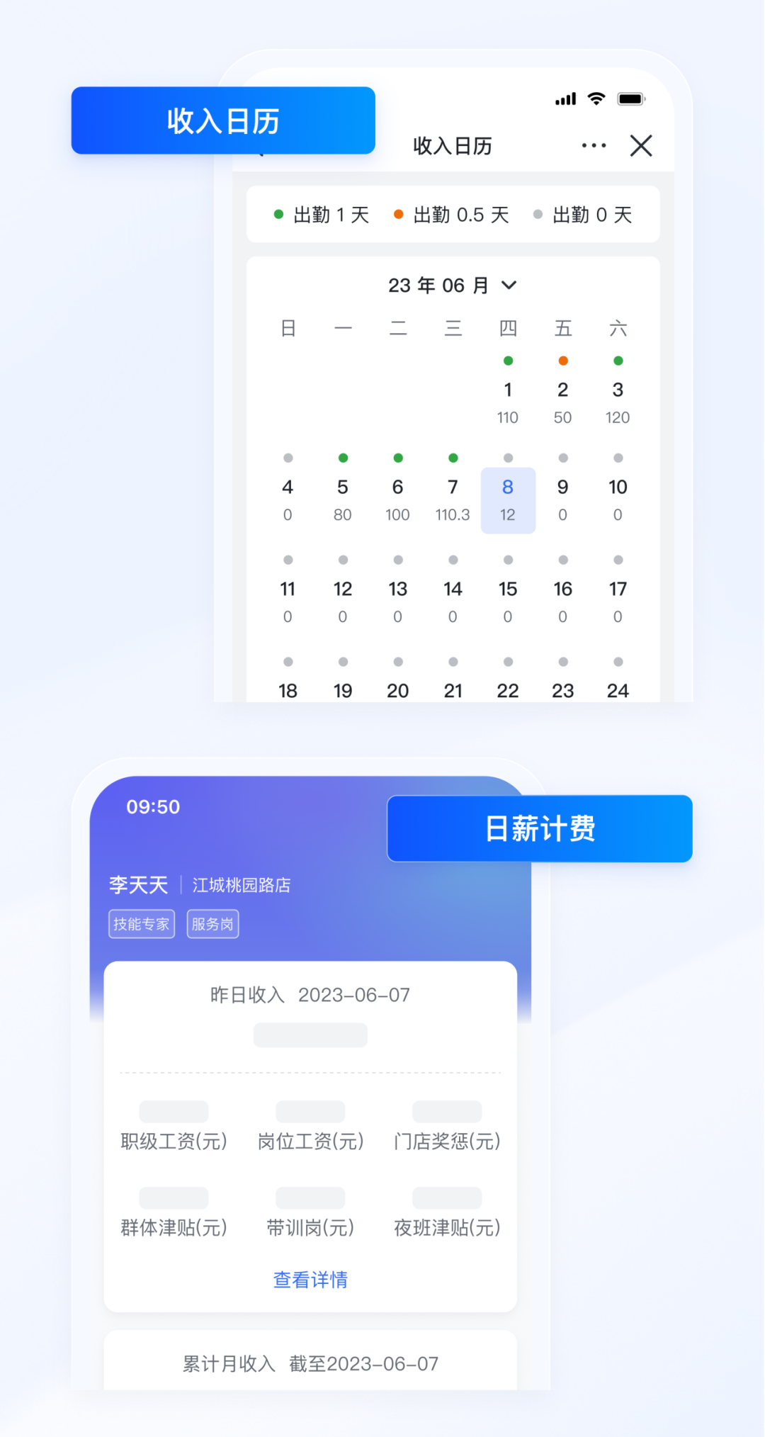 巴奴的数字化团队了解到,门店员工常常向领班了解自己的工作量和日薪计费情况。于是,为了激励一线员工的工作积极性,团队的小伙伴们用 20 天时间,将人力系统的数据同步到巴奴内部的大数据运算平台,实时计算薪资,并在飞书上创建了飞书小程序和工作台组件来展示运算结果。