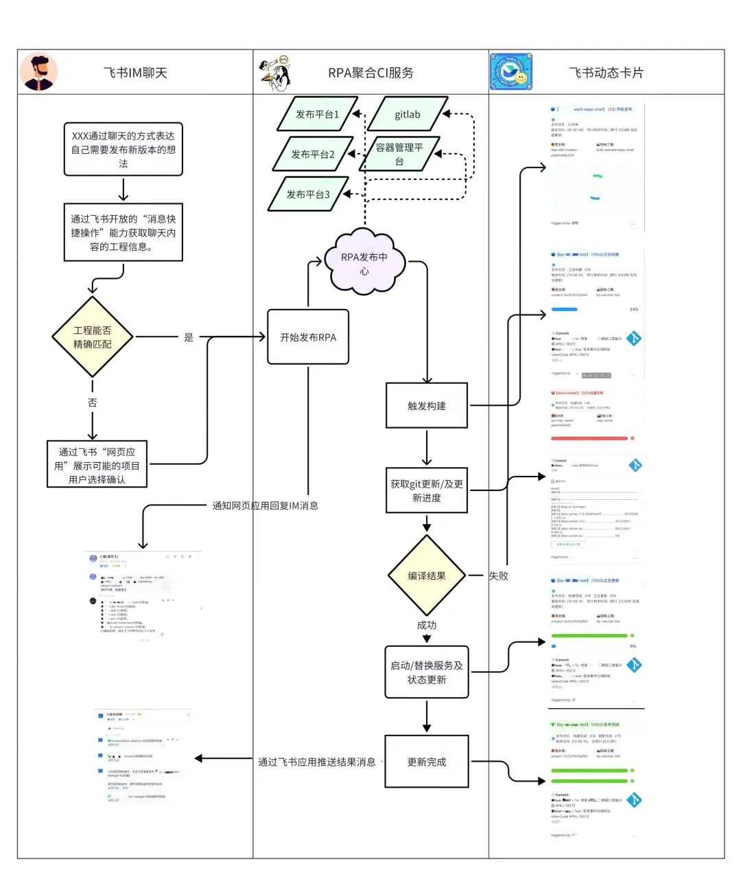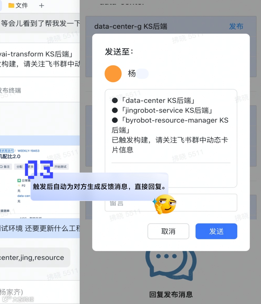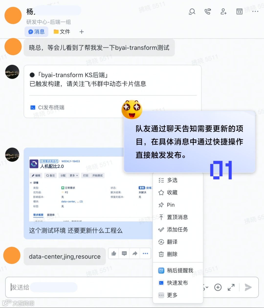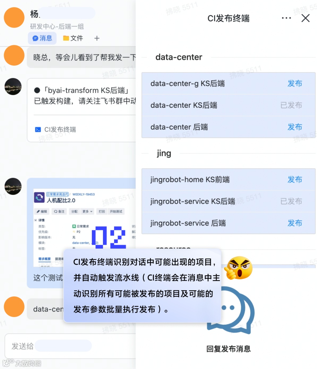 第一步,触发发布。可以在与开发同学的聊天中直接触发,也可以通过给飞书应用发送指令完成。