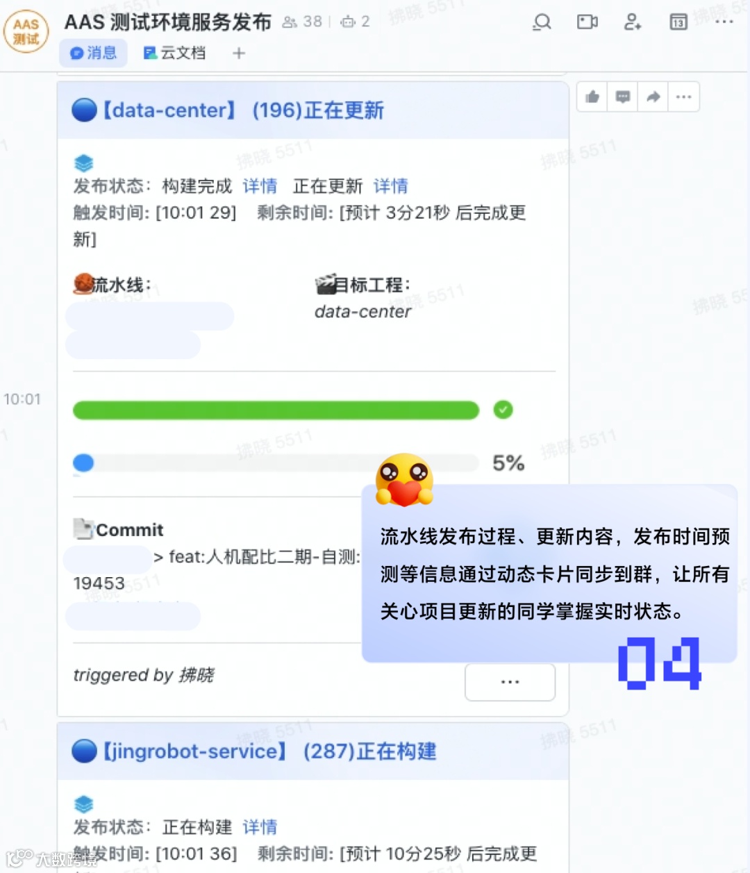 通过动态卡片在群里实时同步进度(关注该工程的可能不止是对话的2个人)