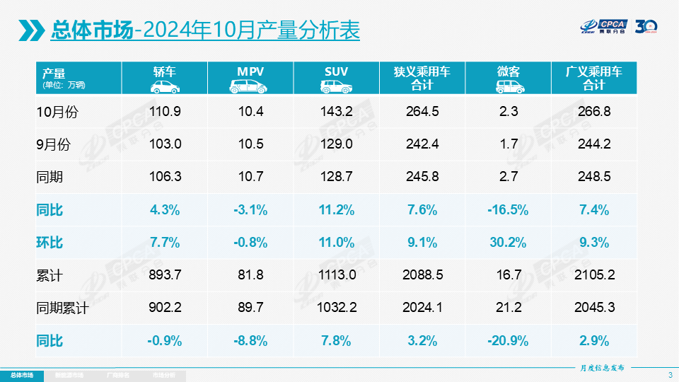 累计来看,2024年1-10月,新能源乘用车产量达到924.4万辆,同比增长35.2%;批发销量927.9万辆,同比增长36.5%;零售销量832.7万辆,同比增长39.8%。