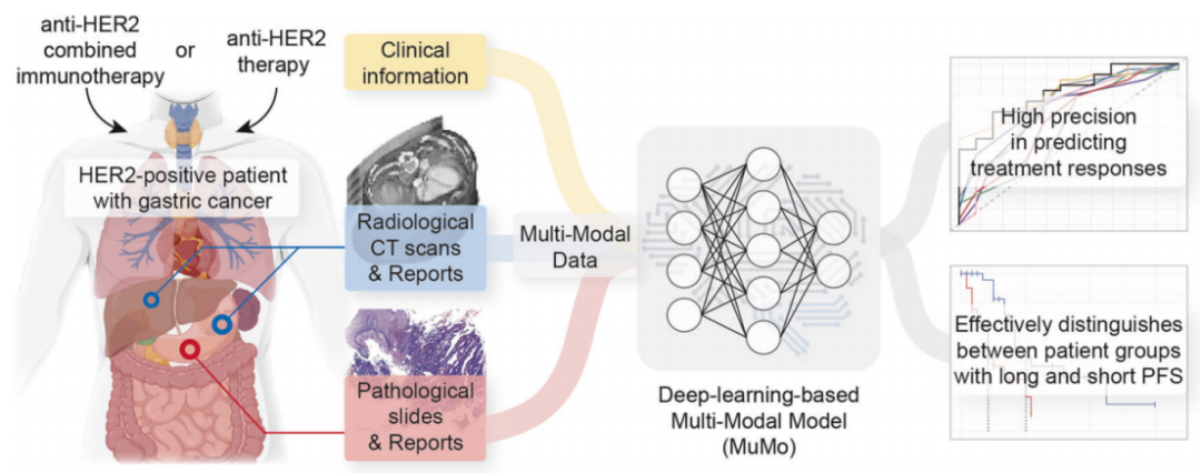 本研究成功开发并验证了一个名为MuMo的多模态深度学习模型,该模型通过整合CT影像、病理切片、临床报告与患者信息,能够精准预测HER2阳性胃癌患者接受抗HER2靶向治疗或其联合免疫治疗的反应。实验结果表明,MuMo不仅展现出优异的预测性能与泛化能力,还能有效区分患者的生存预后,其决策逻辑与临床知识高度一致,为实现胃癌个体化精准治疗提供了可靠且具有临床实用价值的AI工具。