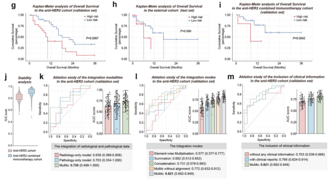 生存分析证实,经MuMo划分的低风险组患者,其无进展生存期和总生存期均显著长于高风险组。例如,在抗HER2队列的独立测试集中,低风险组的中位总生存期为17个月,远高于高风险组的6个月。
