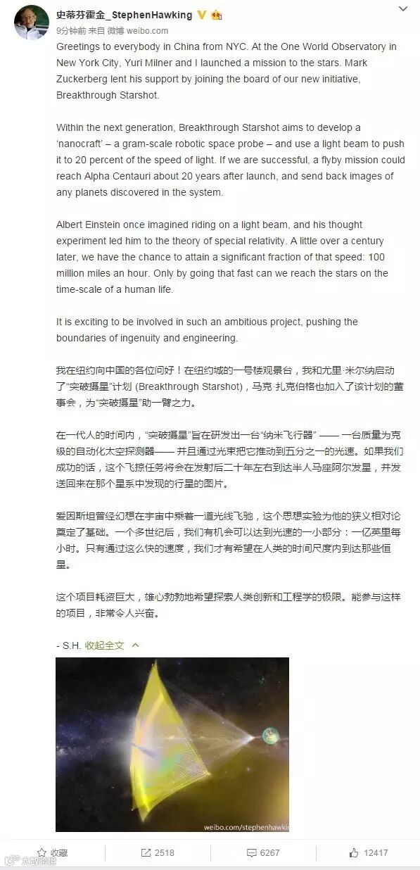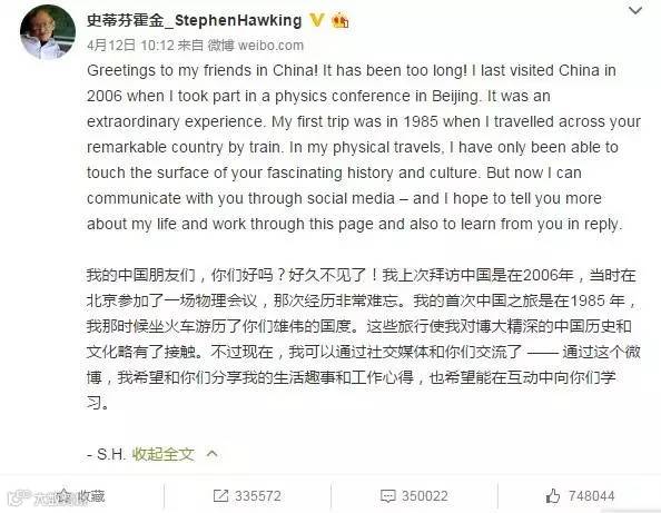微博由霍金团队以及社交媒体公司Stradella Road共同管理维护,落款SH的内容均来自于霍金教授本人。