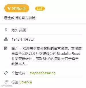 霍金的微博名为“史蒂芬霍金_StephenHawking”,认证为“霍金教授的官方微博”。