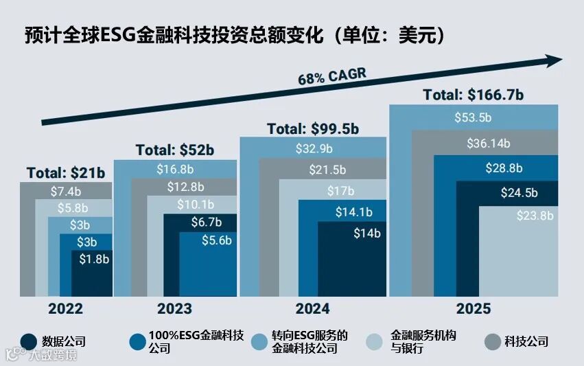 为了解决这些困境,需要更全面的问责制来加速向净零排放的过渡。虽然ESG是一个相对较新的概念,但已成为政策、立法和监管的重点,这些变化为金融科技在ESG领域的发展带来了巨大的机会。根据毕马威的数据,ESG金融科技领域的投资规模将在未来两年内实现68%的复合年增长,成为金融科技行业中增长最快的细分领域。
