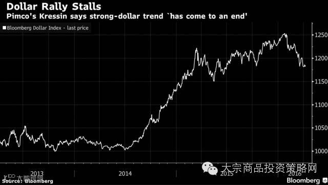 即使高盛在三月发布看多美元的报告之后被市场“打脸”,但该行仍是坚定美元“多头”。而PIMCO则认为美元牛市周期即将终结。(下图来自彭博)