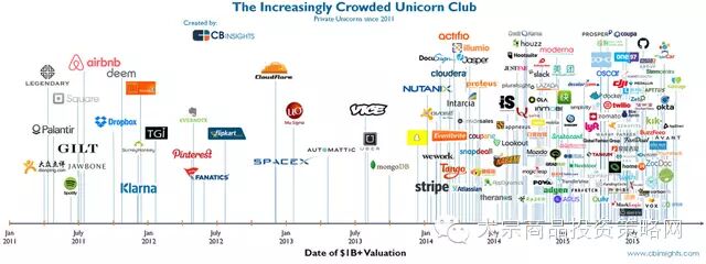 在CB Insights的以下图表中,一家公司的商标出现在时间轴的位置代表了该司首次估值达到10亿美元的时间。如图所示,2011年上半年,还只有大众点评、Palantir等寥寥几家公司荣升“独角兽”,这种状况一直持续到2013年年末。而2014年以来的时间轴段几乎挤满了“独角兽”公司的名称,不放大细看根本分不清到底是哪家。