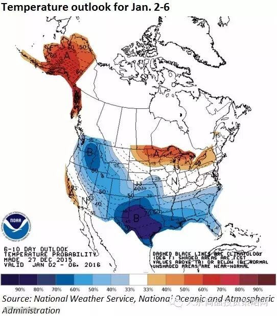 下图可见美国国家海洋和大气管理局(NOAA)预测的明年1月2-6日国内气温。