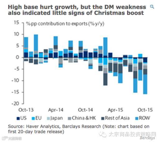 “按出口地划分,向发达国家的出口再次疲软,对美出口同比下降16%(9、8月下降3.8%和4.8%),对欧盟出口下降4.4%(9、8月分别增长19.7%和下降20.9%),”巴克莱写道。“对发达国家出口的疲软部分是因为去年的高基数,但它也表明没有来自圣诞节的订单。”