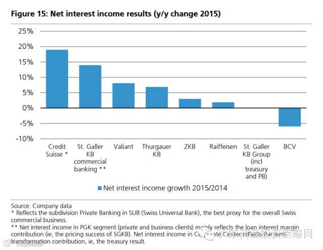 瑞士的收益率曲线持续处于负值区间,尽管这样,多数银行2015年净息差收入还是录得增长,这主要由于:1.大量再定价(住房抵押贷款的利润翻了一倍有余);2.成功的对冲策略。住房抵押贷款的客户相当于在‘补偿’存款客户。