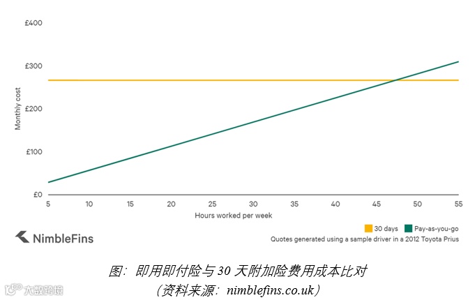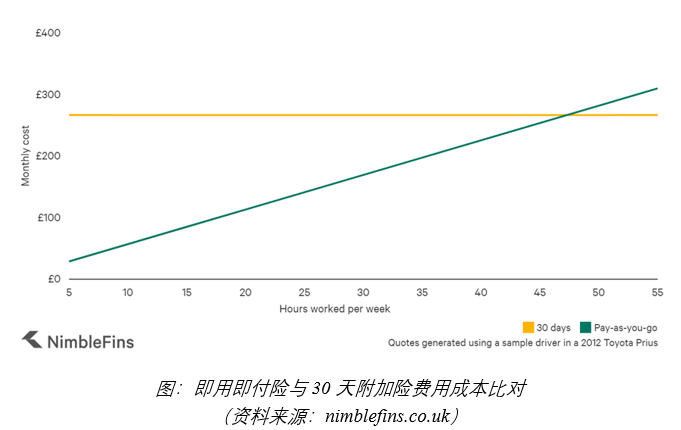 值得注意的是,即用即付险和30天附加险在产品性质上没有本质不同,其主要区别在于驾驶者的工作时长。根据Zego官方公布,两种保险的无差异工作时长为20小时/周,而英国市场研究机构NimbleFins以丰田普锐斯这一常见轿车型号为例计算的无差异工作时长则为45小时/周。实际上,无差异工作时长可能会因驾驶者的年龄、性别、行驶记录和车辆型号等多种因素发生变化,对于每周工作小时数较低的驾驶者而言,即用即付险无疑是更为优惠的选择。