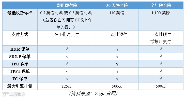 Zego是英国目前唯一的即用即付H&R保单提供商。此类保险通常较为灵活,车主可以在从事运输工作时得到有效保护。驾驶者只需按照实际的工作时长缴纳保险费用,每小时费用通常在0.80-2.30英镑之间,Zego会在客户工作结束时自动停止计费。