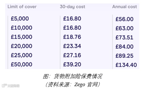 购买Zego货车保险的客户需满足4个条件:1)年龄在21-75岁之间;2)拥有英国/欧盟/国际货车驾照;3)过失索赔不超过3起且任何形式的索赔不超过4起;4)投保车辆的座位数量不超过9个(符合乘用车标准)。且对于3年内没有发生任何保险索赔事件的驾驶者,Zego提供了高达11%的保费折扣。此外,Zego还提供了货物附加险,保险额度为5,000-50,000英镑不等,期限选择可以是30天或全年。根据保险额度和期限的不同,货物附加险的保费情况也有所差异。