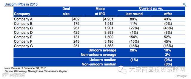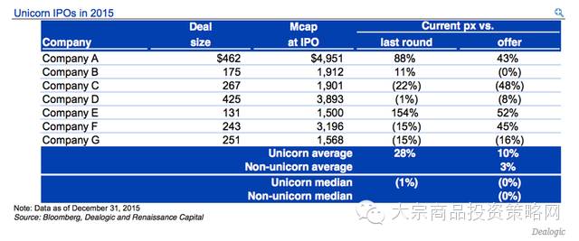 德银科技股权资本市场团队给客户的报告列出了7家在去年上市的独角兽公司,报告显示这些公司并没有出现年末股价齐超发行价的趋势。