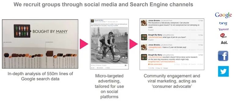 成立之初,Bought By Many类似于一个连接客户和保险公司的保险团购平台。Bought By Many通过对网络搜索信息进行大数据分析,发掘潜在需求,同时在网站上征集客户意愿,根据高频关键词创建群组,吸引有相同保险需求的客户加入。顾客在社交媒体或搜索引擎上看到Bought By Many的广告、点击并成为会员、加入相关的群组,当群组人数达到一定的规模时,Bought By Many便会代表用户与保险公司进行谈判,协商团体保费折扣或定制顾客需要的保险产品。目前,Bought by Many共建立了322个群组,分为八大保险类别。