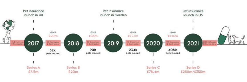 凭借其先进的数字技术、卓越的客户服务和创新的商业模式,Bought By Many在短短几年内成长为欧洲领先的宠物保险提供商之一,在全球范围内覆盖近50万只宠物。公司保费规模 (GWP) 连续三年翻倍,在2020年超过2.2亿美元。2021年6月获得3.5亿美元的D轮融资,公司估值达19.5亿美元。