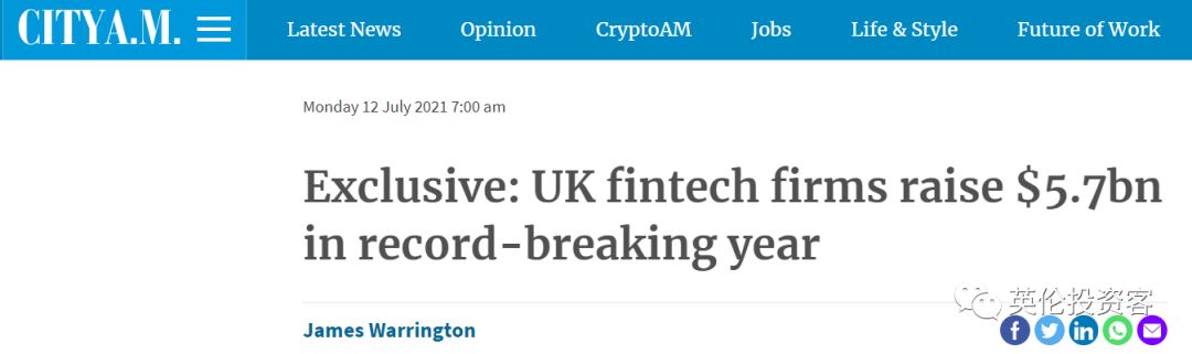 数据显示,英国金融科技公司在2021年迎来井喷式发展,仅上半年就筹集了57亿美元(约370亿人民币)。