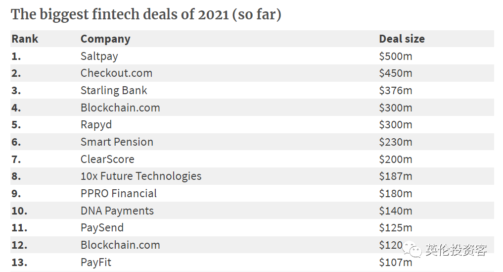 下表显示了2021年上半年全球金融科技领域最大的13笔融资,其中位于伦敦的公司占据了前4名。
