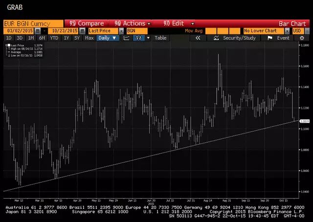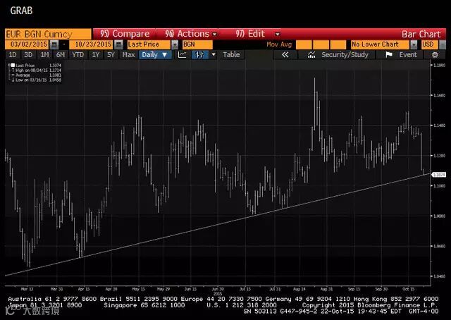 对于德拉吉的鸽派言论,欧元报之以暴跌,并测试了自今年3月见底——1.0460以来形成的7个月的上升趋势线的支撑力度。彭博终端上的截图展示了这一过程。这条趋势线连接了4月、7月和8月以来的低点,现在位于1.1075附近。这附近也是3月欧元见底反弹以来的50%回撤位(1.1085)。61.8%回撤位在1.0940附近,在这之下的就是5月和7月都撑住了的1.08。从昨日的下跌来看——触及了布林带下轨(略低于1.11)后止跌,玩家们可能不太愿意在周末来临之际激进地推进。