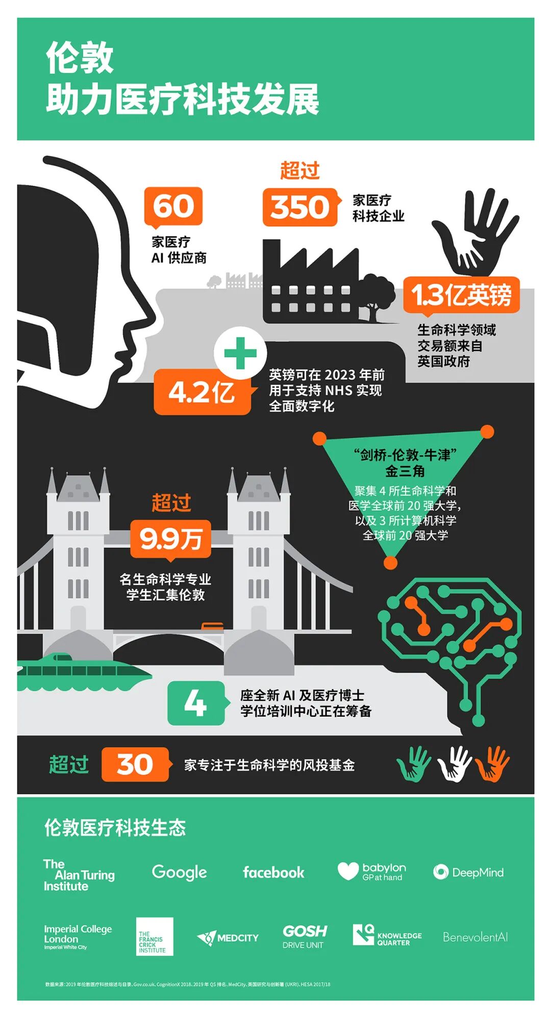 这里有60家医疗AI供应商,拥有超过350家医疗科技企业和超过9.9万名生命科学专业学生。多个全球领先的科研机构汇聚伦敦,包括弗朗西斯·克里克研究所(Francis Crick Institute)、癌症研究院(The Institute for Cancer Research)和艾伦·图灵研究所(The Alan Turing Institute)。
