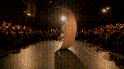 他在舞台上发明了一种独特的乐器——由一块33公斤重的弓形结构的木板和一根金属的“弦”构成的道具。它即是乐器,又是承载舞者身体的支点,舞者就像船上的水手一样骑在乐器上摇摆,跳舞,跳动。