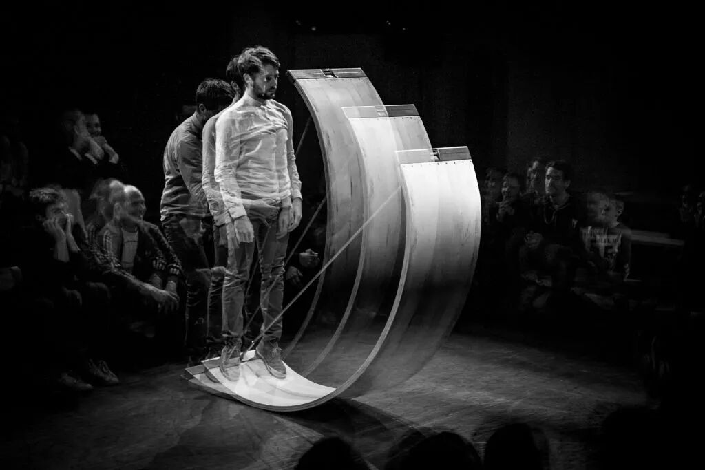 该作品来自法国的艺术家乔纳森·贾查德(Jonathan Guichard),受过马戏艺术的影响和切尔克斯人(一个西北高加索民族)文化的启发,他将舞蹈、平衡游戏与乐器带上舞台,以此探索身体与技巧之间关系。