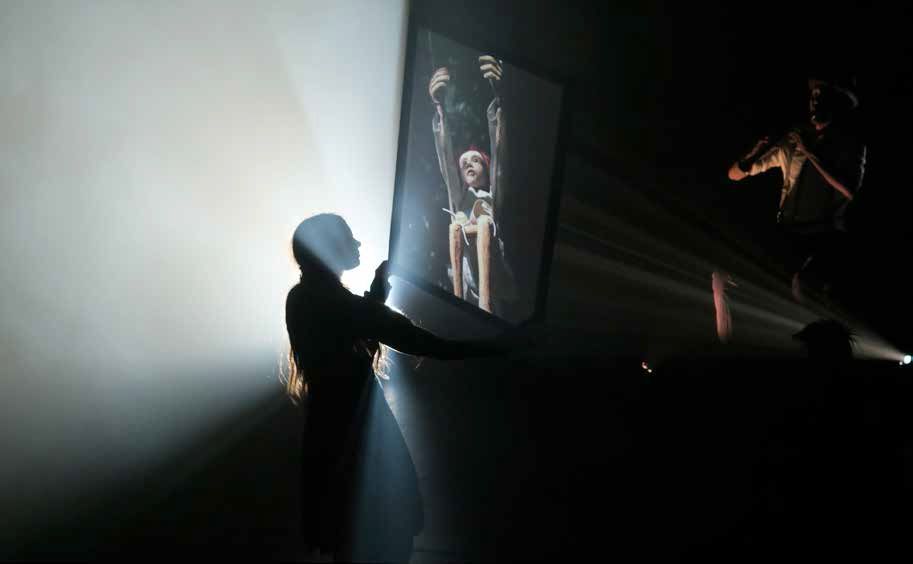 舞台上方是投影屏幕,下方则是狂热的活动,可以实时创建观众所看到的图像,并伴有关于七个意外死亡的梦幻般的叙事。这就像在一边看电影,一边看电影的制作过程。比如我们看着一个人用相机摇一束灯;而在屏幕上,我们看到的却是它们像万花筒中的烟花一样爆炸。