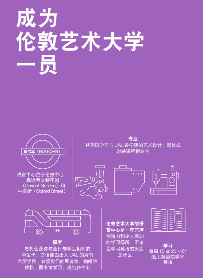 学生将在位于伦敦市中心的校区学习英语课程,加上伦敦艺术大学六所学院之一提供的创意科目。