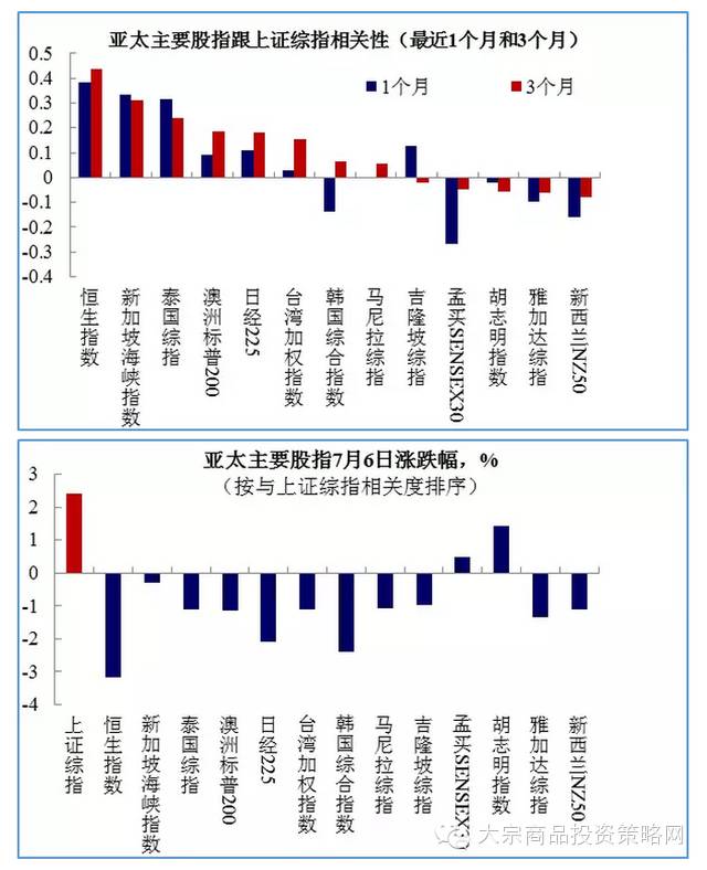 周末希腊公投的结果是否决了国际救助方案,导致希腊退欧风险明显上升,给欧元区的未来带来很大的不确定性。这可能导致了全球的风险偏好的下降,拖累全球风险资产。从亚太主要股指的走势来看,跟中国股市相关度较高、负相关的市场都出现了普遍下跌,指向希腊公投结果造成了全局性的负面冲击。
