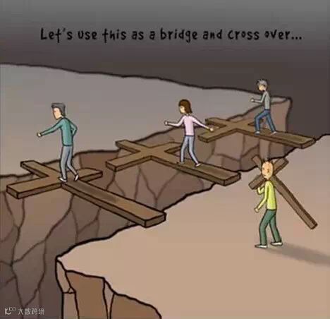 后面的人都慢慢地赶上来了,他们用自己背负的十字架搭在沟上,做成桥,从容不迫地跨越了沟壑。