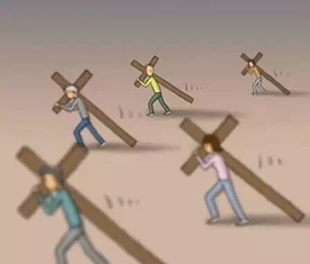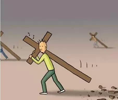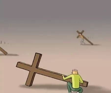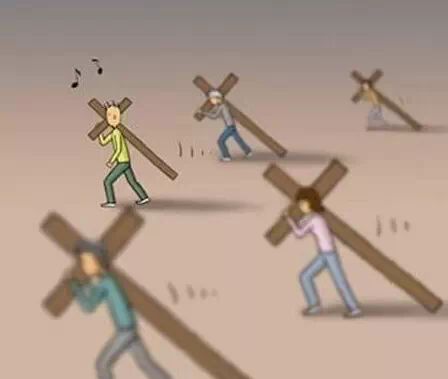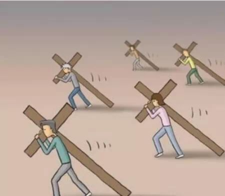 第一幅漫画中,每个人都背负着一个沉重的十字架,在缓慢而 艰难地前行!