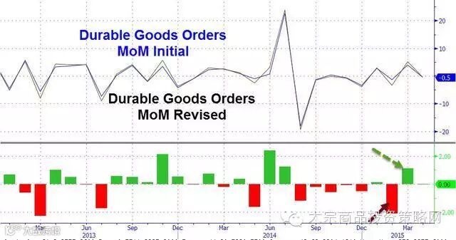 下图可见3月耐用品订单环比增长明显上修,绿色柱形代表正增长,黑线代表修正后环比增长走势。