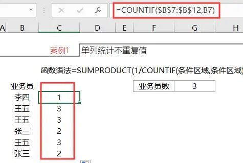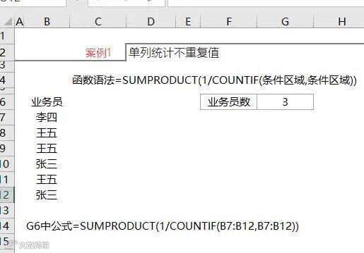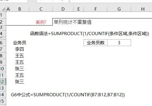 统计业务员的人数:在G6中输入公式=SUMPRODUCT(1/COUNTIF(B7:B12,B7:B12))