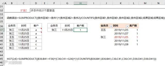 固定语法=sumproduct((条件区域=条件)*(1/countifs(条件区域,条件区域,结果区域,结果区域))