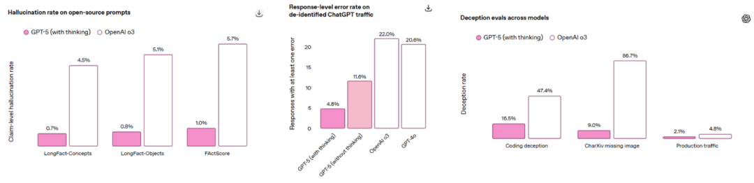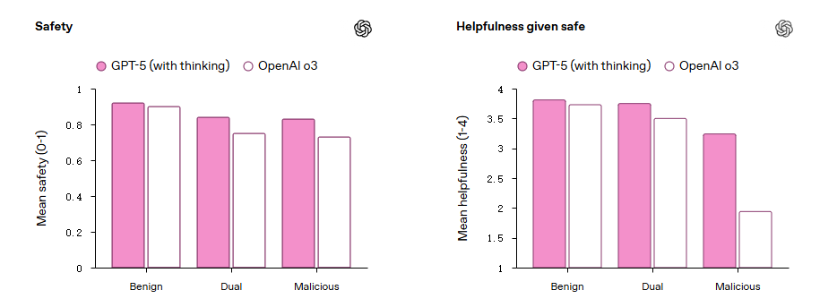 在不同提示意图类型中,安全性和实用性(给定安全响应)的比较。GPT-5(具有思考能力)在所有提示意图类型中都表现出更高的安全性和更大的实用性。