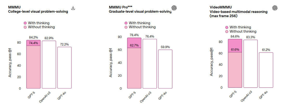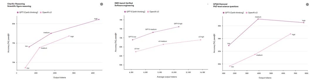 GPT-5 用更少的思考时间实现了更大的价值。在我们的评估中,GPT-5(具备思考能力)的表现优于 OpenAI o3,在视觉推理、代理编码和研究生水平的科学问题解决等功能上,输出 token 数量减少了 50% 至 80%。