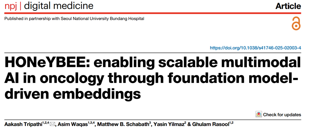 本文题为《HONeYBEE: enabling scalable multimodal AI in oncology through foundation model-driven embeddings》由Aakash Tripathi、Asim Waqas等来自Moffitt癌症中心和南佛罗里达大学团队提出,构建了一个可扩展的肿瘤多模态医学数据统一表示框架。该系统通过领域专用基础模型处理临床结构化与非结构化文本、病理全切片图像、放射影像及多组学数据,生成患者级嵌入,用于癌种分类、生存预测、相似患者检索与队列聚类等任务。在TCGA 33种癌症、11,400余名患者数据中验证,结果显示临床信息嵌入表现最强,多模态融合在特定癌种中取得额外获益。该研究为肿瘤精准医学提供了统一、模块化的多模态AI基础设施,推动临床可解释与可部署AI发展。