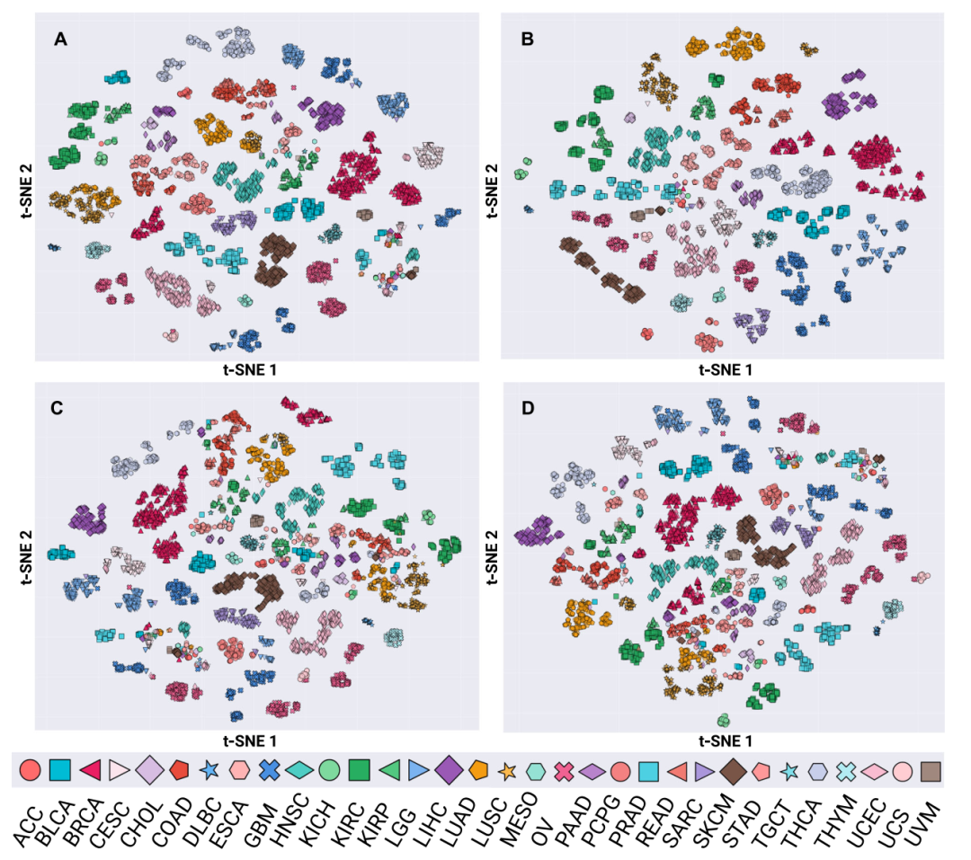 图2 由四种语言模型生成的临床文本嵌入的t-SNE可视化,按TCGA癌症类型着色
