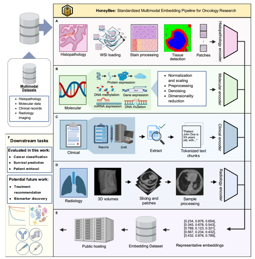 HONeYBEE是一个开源框架,集成了用于肿瘤学应用的多模态生物医学数据。它处理临床数据(结构化和非结构化),全切片图像,放射学扫描和分子谱,使用特定领域的基础模型和融合策略生成统一的患者级嵌入。